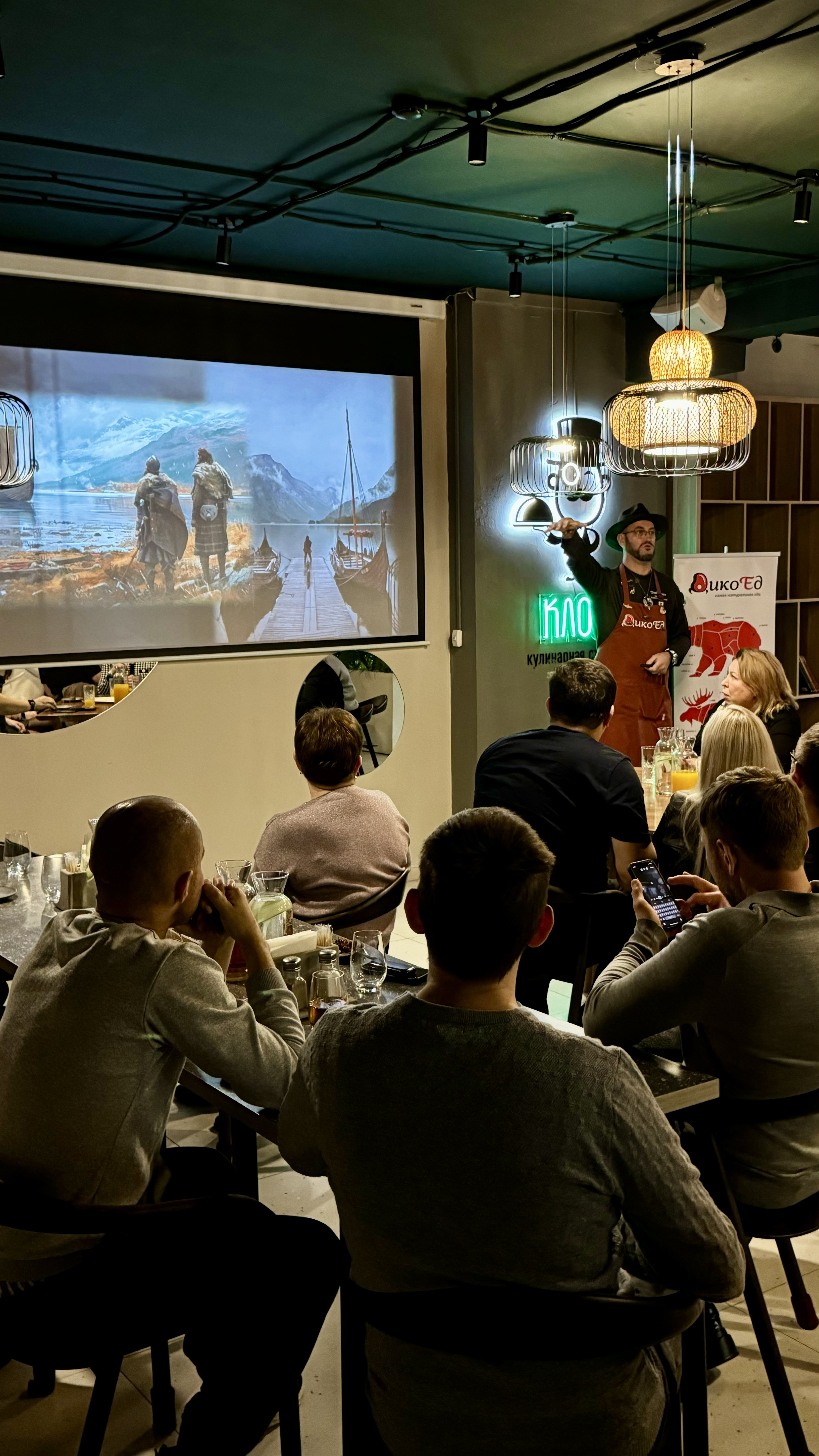 На мероприятии наш шеф готовил дичь, но назвать это мастер-классом мы бы не смогли! Всех участвующих ждало интерактивное музыкальное, световое и игровое шоу о великом походе викингов по пути "из варяг в греки" в Константинополь!